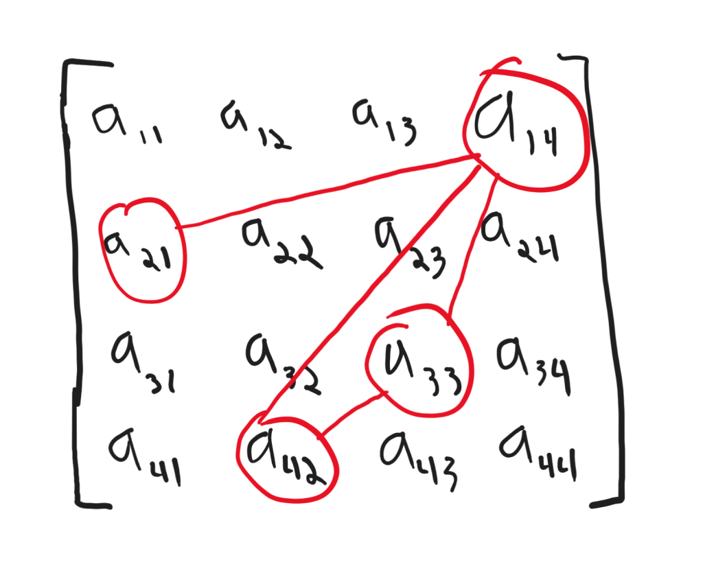 This shows all 4 different inversions between a sequence of matrix elements that satisfy the determinant’s unique row and column policy. Here, the lines connect inverted elements.