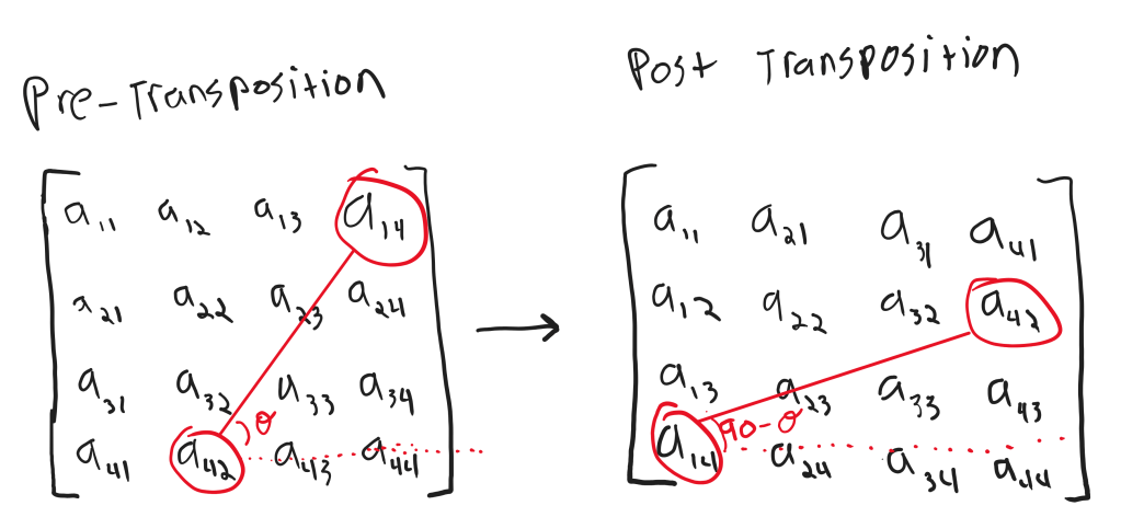 with the rows of the matrix prior to the transposition, and an angle of